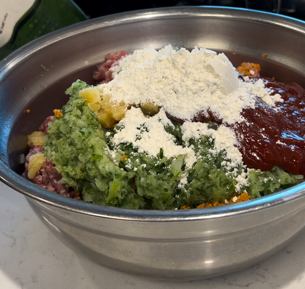 ์ฌ๋ฃ: ๋ผ์ง๋ค์ง์ก 400g, ์๊ณ ๊ธฐ๋ค์ง์ก 500g, ์ํ 2๊ฐ, ๋ํ 2๊ฐ, ํ๊ณ ๋ฒ์ฏ 3๊ฐ, ๋น๊ทผ 3๊ฐ, ๋ค์ง๋ง๋ 2ํฐ์ , ์ผ์ฐน ์ข