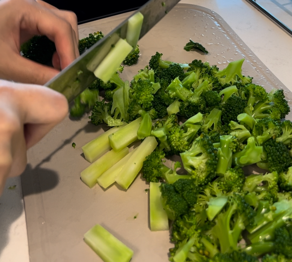 6. ๋ฐ์ณ์ค ๋ธ๋ก์ฝ๋ฆฌ๋ฅผ ์๊ธฐ๊ฐ ๋จน์ ์ ์๋ ํฌ๊ธฐ๋ก ์ฐ์ด์ฃผ์ธ์. ์ ๋ ์ค๊ธฐ๋ ์ข์ํด์ ์๋ฒ๋ฆฌ๊ณ ์๋ผ์คฌ์ด์